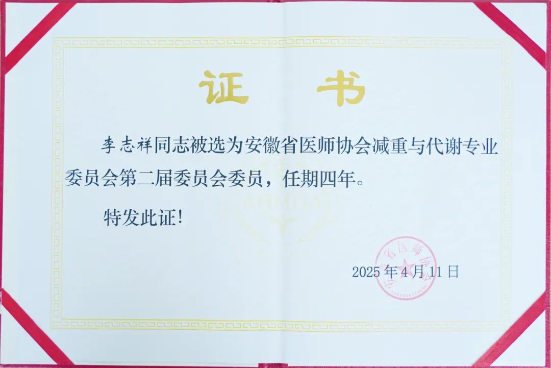 此次任命,不僅是對李志祥主任個人能力的肯定,更標志著我院減重與代謝專業技術獲得了權威認證。合肥佰惠醫院將以此為契機,持續深化專科建設,推動減重與代謝專業的高質量發展,為超重及代謝異常患者提供科學、系統、可持續的健康管理方案,助力更多患者實現科學減重,重獲健康人生。