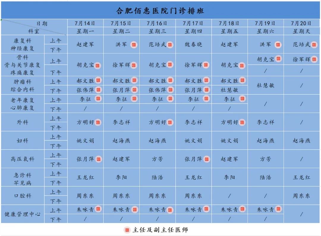 為方便廣大市民了解合肥佰惠醫(yī)院門診醫(yī)師出診安排,現(xiàn)發(fā)布本周(7月14日-7月20日)門診醫(yī)師排班表,請大家合理安排就診時間。如遇停診、換診等特殊情況有所調(diào)整,以當日出診安排為準,造成不便敬請諒解!