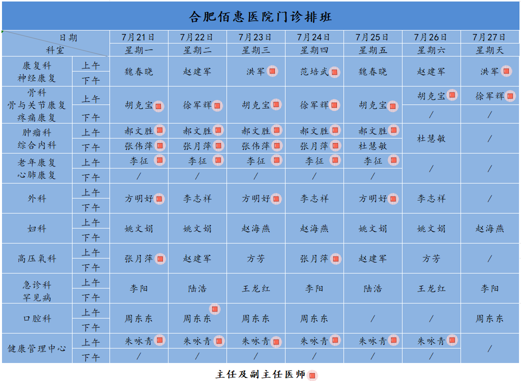 為方便廣大市民了解合肥佰惠醫院門診醫師出診安排,現發布本周(7月21日-7月27日)門診醫師排班表,請大家合理安排就診時間。如遇停診、換診等特殊情況有所調整,以當日出診安排為準,造成不便敬請諒解!