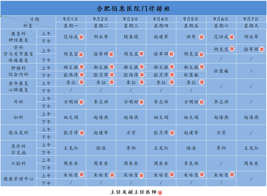 為方便廣大市民了解合肥佰惠醫(yī)院門診醫(yī)師出診安排,現(xiàn)發(fā)布本周(9月1日-9月7日)門診醫(yī)師排班表,請大家合理安排就診時(shí)間。如遇停診、換診等特殊情況有所調(diào)整,以當(dāng)日出診安排為準(zhǔn),造成不便敬請諒解!