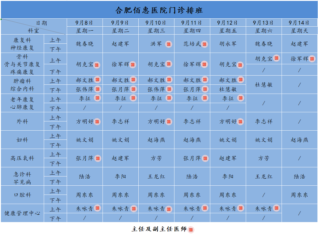 為方便廣大市民了解合肥佰惠醫(yī)院門診醫(yī)師出診安排,現(xiàn)發(fā)布本周(9月8日-9月14日)門診醫(yī)師排班表,請大家合理安排就診時間。如遇停診、換診等特殊情況有所調(diào)整,以當(dāng)日出診安排為準(zhǔn),造成不便敬請諒解!