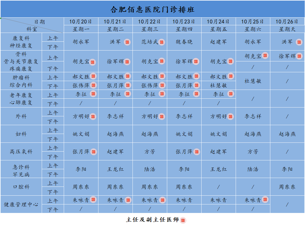 為方便廣大市民了解合肥佰惠醫(yī)院門診醫(yī)師出診安排,現(xiàn)發(fā)布本周(10月20日-10月26日)門診醫(yī)師排班表,請(qǐng)大家合理安排就診時(shí)間。如遇停診、換診等特殊情況有所調(diào)整,以當(dāng)日出診安排為準(zhǔn),造成不便敬請(qǐng)諒解!