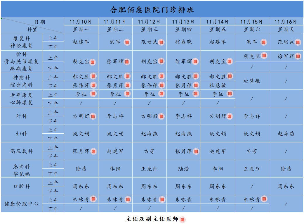 為方便廣大市民了解合肥佰惠醫(yī)院門診醫(yī)師出診安排,現(xiàn)發(fā)布本周(11月10日-11月16日)門診醫(yī)師排班表,請大家合理安排就診時間。如遇停診、換診等特殊情況有所調(diào)整,以當(dāng)日出診安排為準(zhǔn),造成不便敬請諒解!