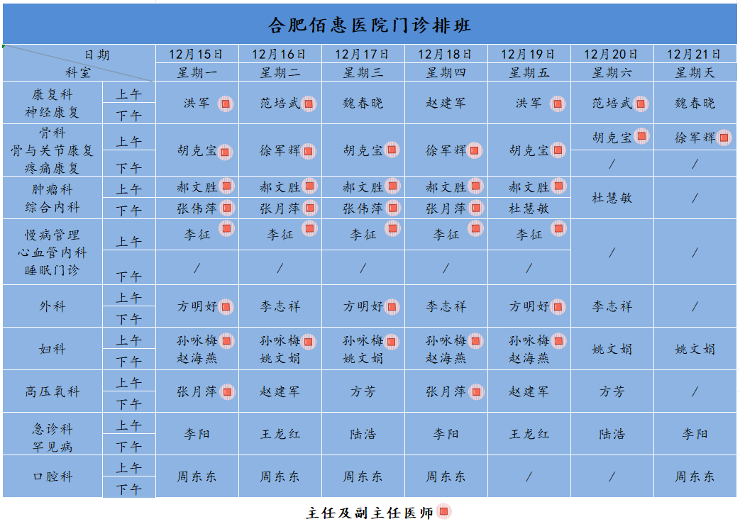 為方便廣大市民了解合肥佰惠醫院門診醫師出診安排,現發布本周(12月15日-12月21日)門診醫師排班表,請大家合理安排就診時間。如遇停診、換診等特殊情況有所調整,以當日出診安排為準,造成不便敬請諒解!